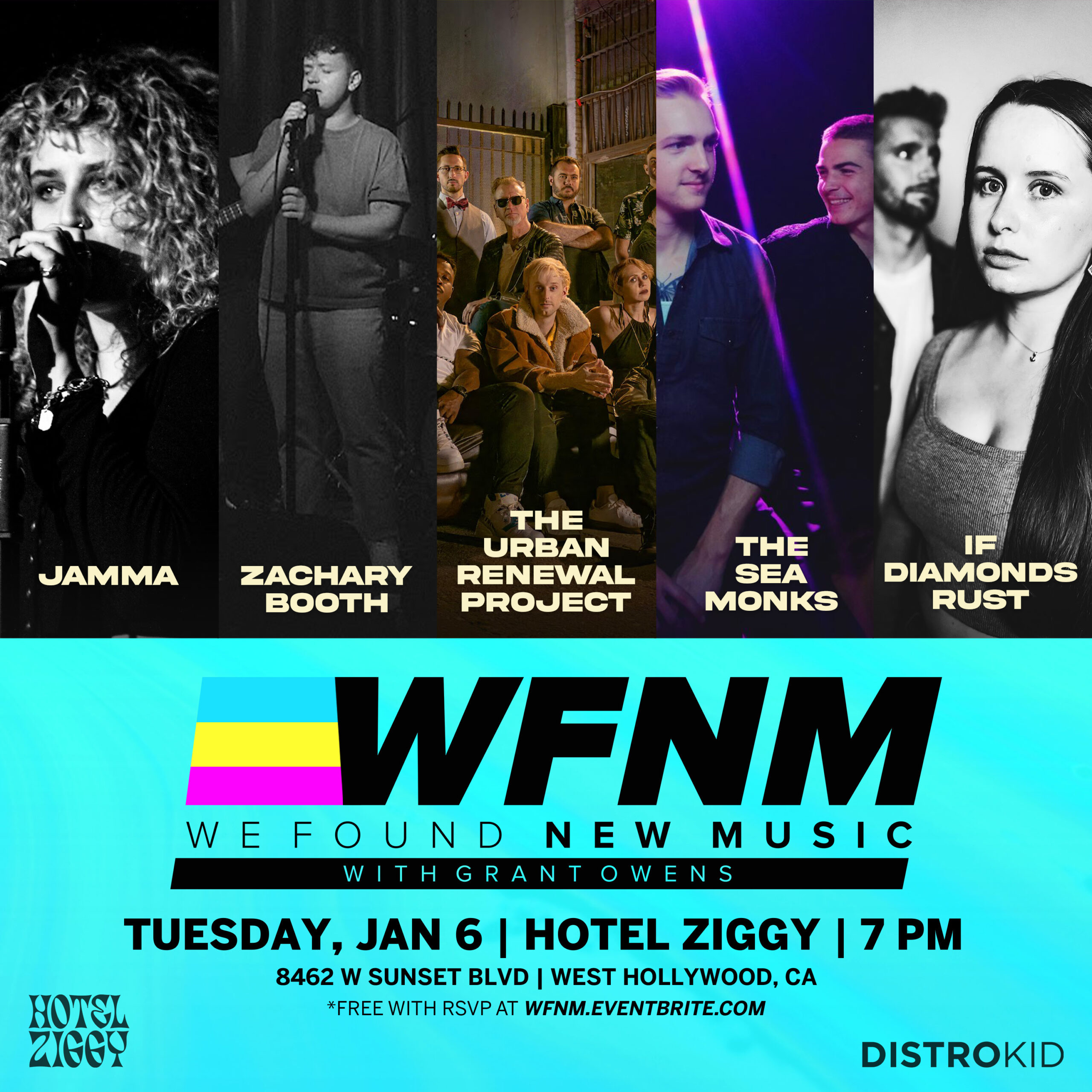 We Found New Music Showcase with Grant Owens. 7PM 21+ Free with RSVP at http://wfnm.eventbrite.com JAMMA ZACHARY BOOTH THE URBAN RENEWAL PROJECT THE SEA MONKS IF DIAMONDS RUST