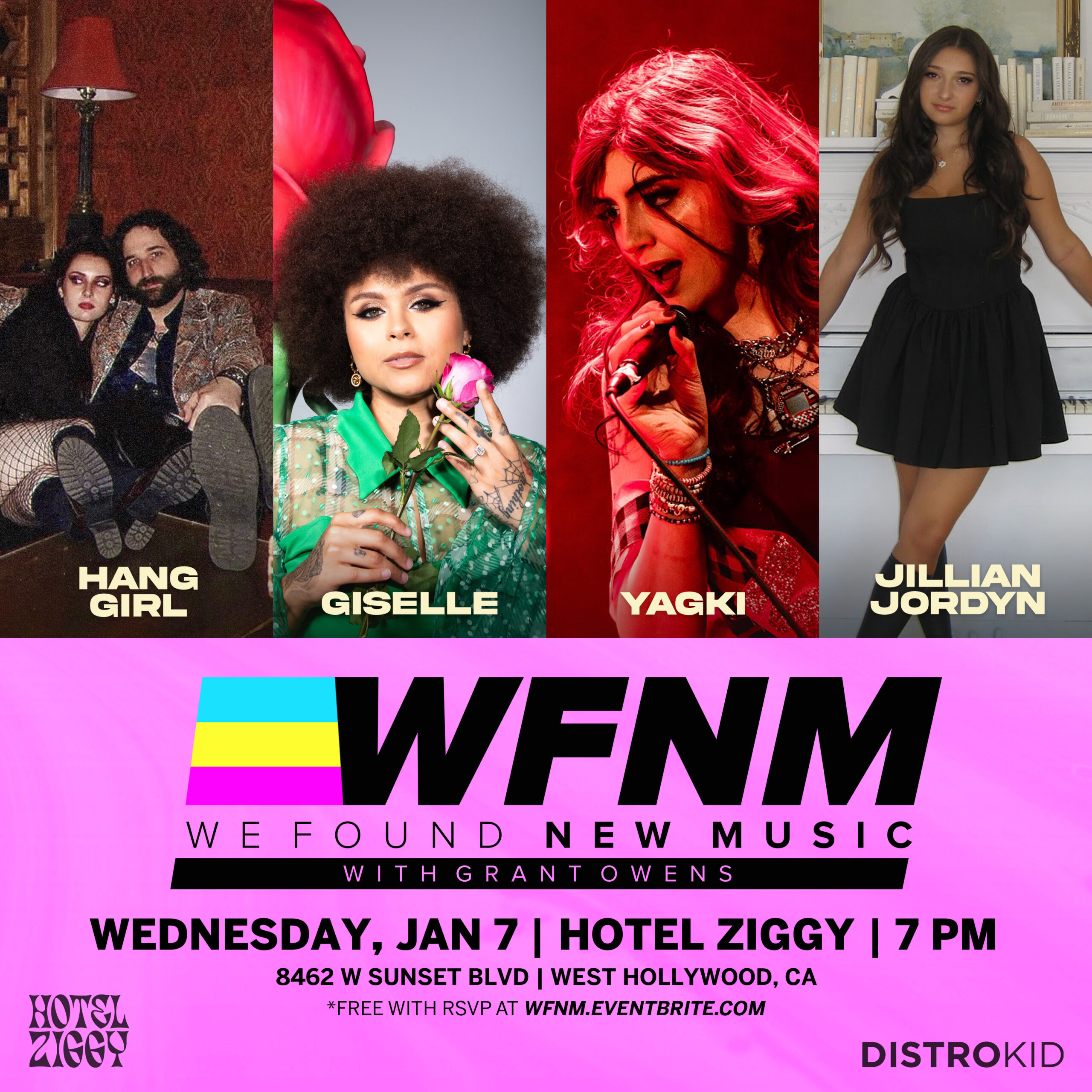 We Found New Music Showcase with Grant Owens. 7PM 21+ Free with RSVP at http://wfnm.eventbrite.com HANG GIRL GISELLE YAGKI JILLIAN JORDYN