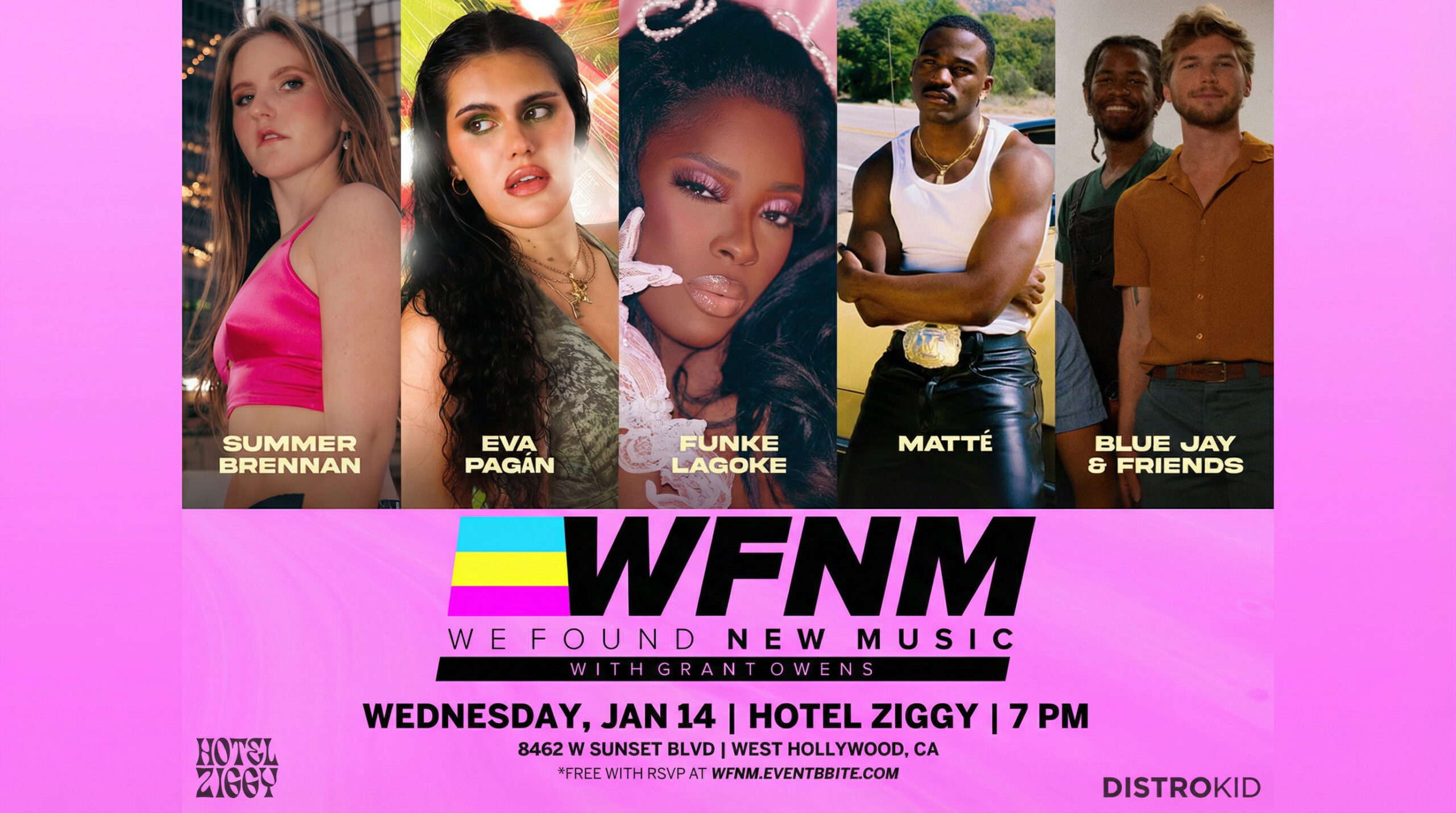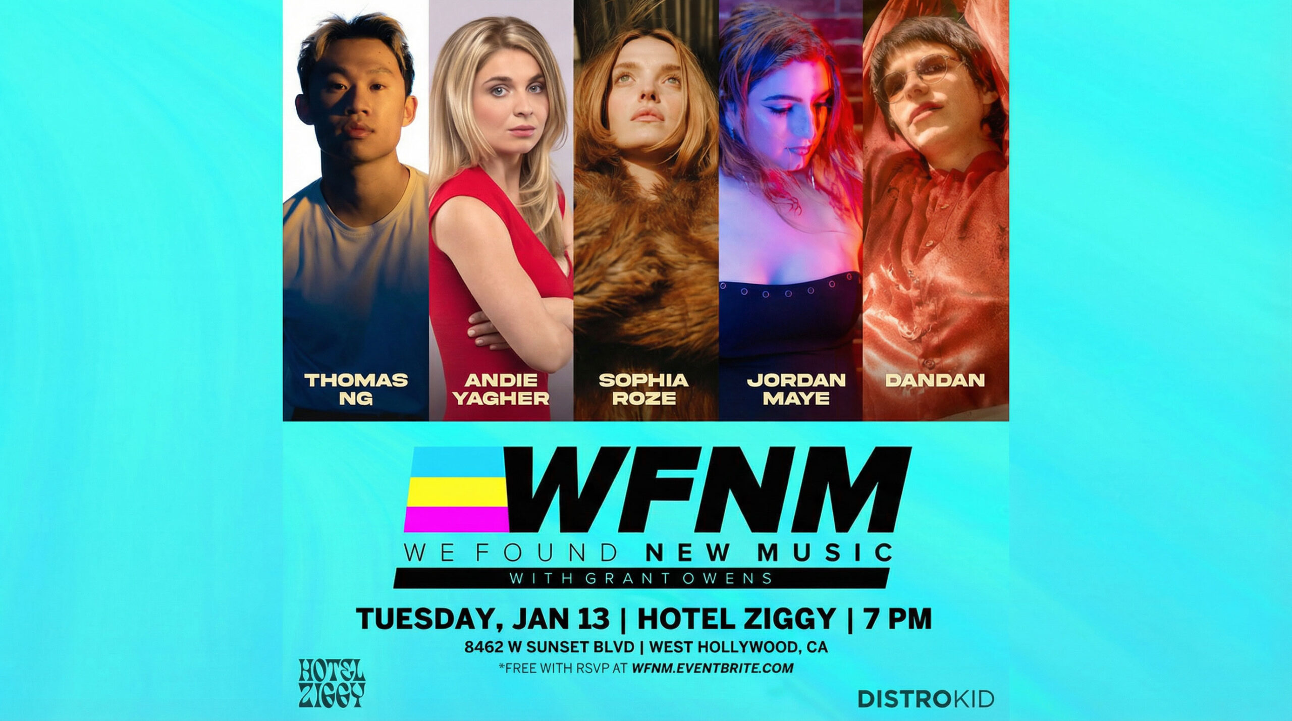 We Found New Music Showcase with Grant Owens. 7PM 21+ Free with RSVP at http://wfnm.eventbrite.com THOMAS NG ANDIE YAGHER SOPHIA ROZE JORDAN MAYE DANDAN SUMMER BRENNAN EVA PAGAN FUNKE LAGOKE MATTE BLUE JAY & FRIENDS