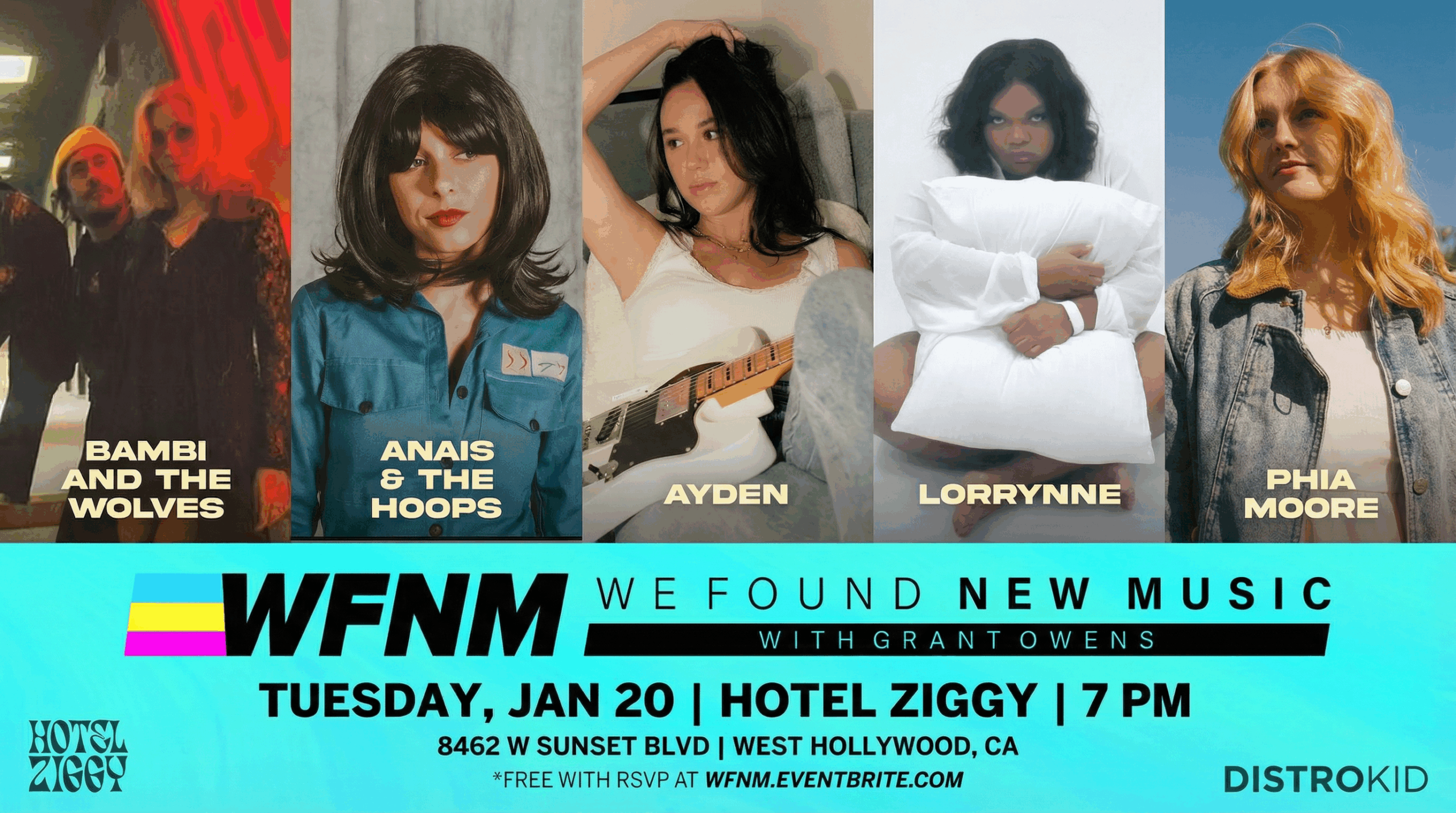 We Found New Music Showcase with Grant Owens. 7PM 21+ Free with RSVP at http://wfnm.eventbrite.com BAMBI AND THE WOLVES ANAIS & THE HOOPS AYDEN LORRYNNE PHIA MOORE