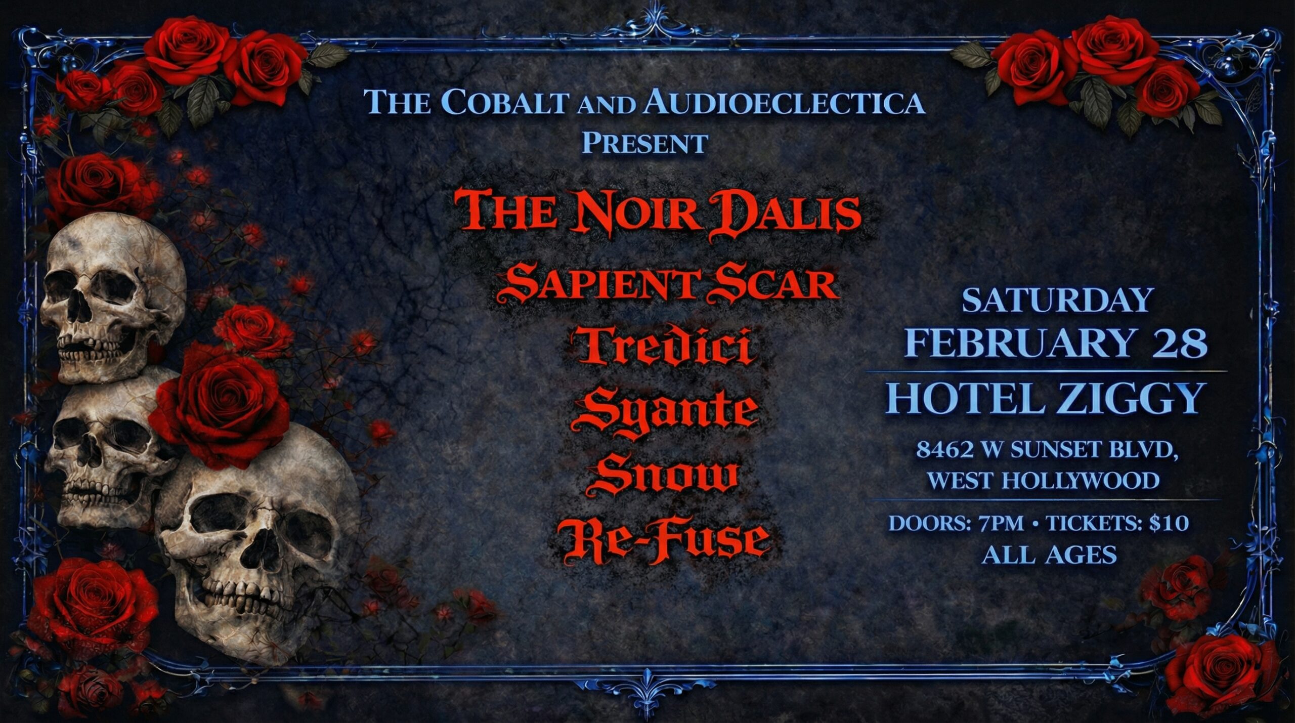 Tickets: $10 AT THE DOOR The Noir Dalis Sapient Scar Tredici Syante Snow Re-Fuse